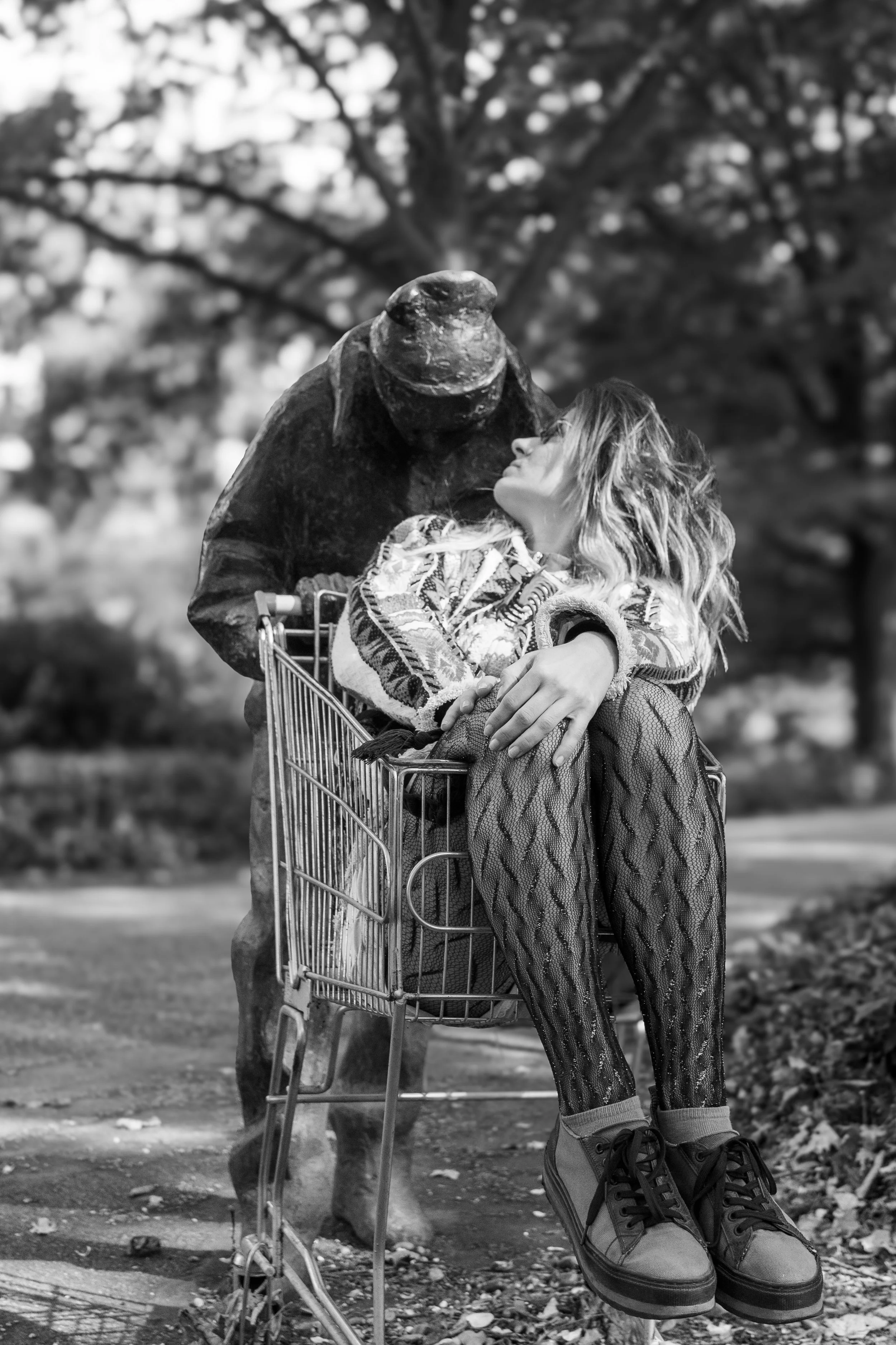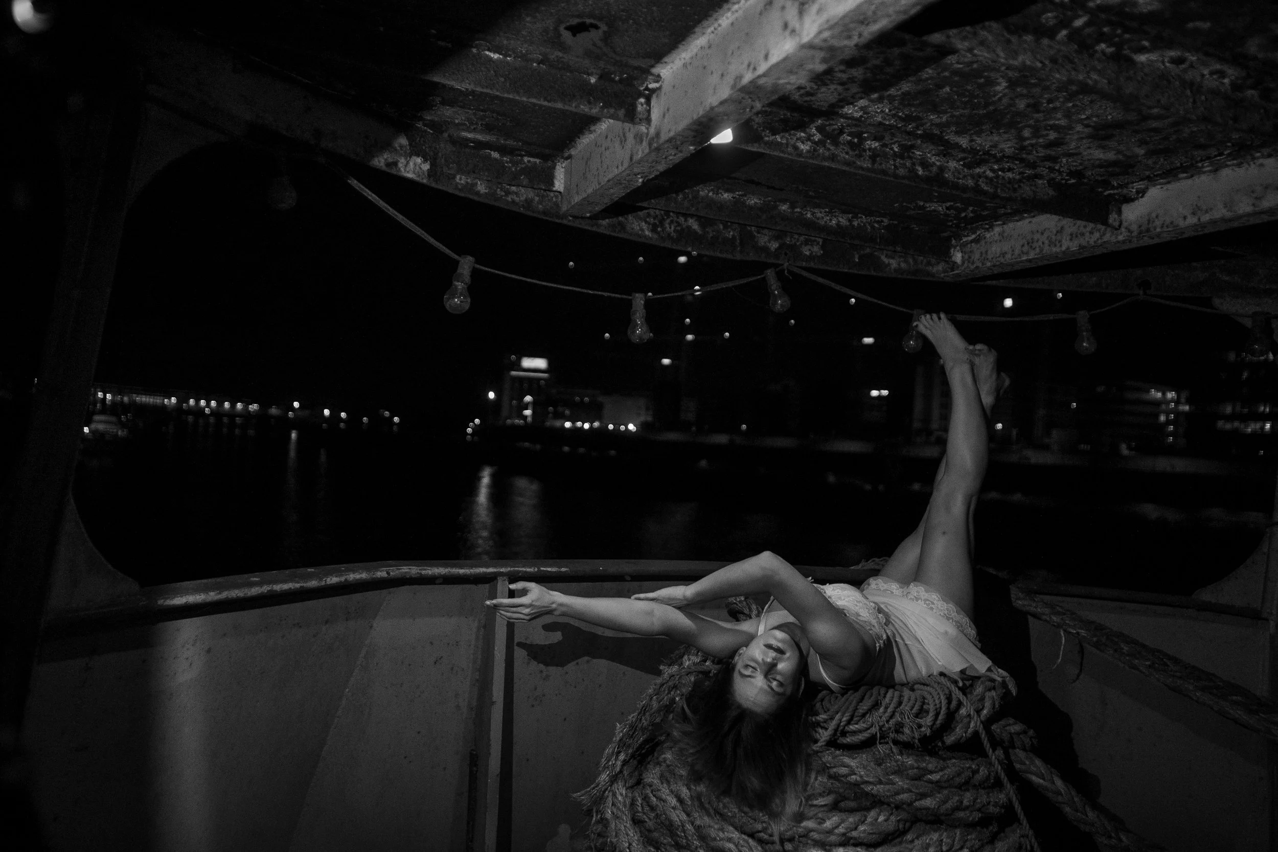 We met at a thrift store close to the docks with barely 30 minutes before closing time. Most of the racks held junk. One Britney Spears costume was politely declined, instead, she grabbed a lace nightgown, the one you see in the photos while I suggested to shoot at some underground spot with her cheerleader-style bunny costume. She laughed, it was already packed for the Venus convention in Berlin and didn’t take up much space. Outfits in hand, we hurried to the ship to scout spots, synchronise our ideas and find our creative flow.