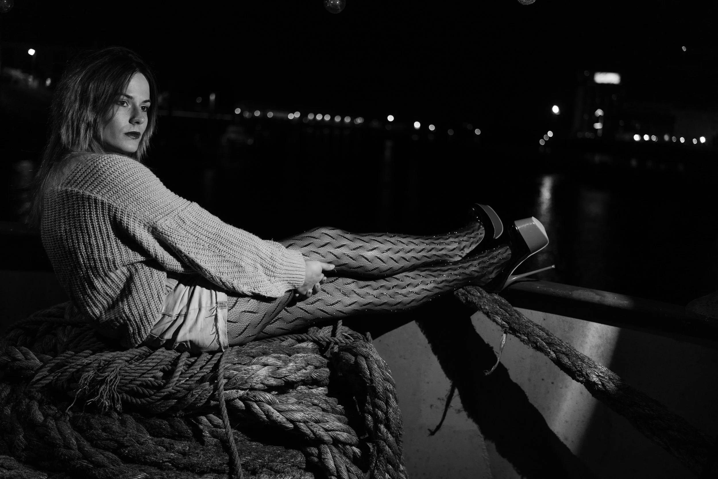 Once aboard, the rusty steel, heavy ropes and river lights turned into a stage. Jogilė slipped into the vintage nightgown, “laughing” about wearing lace on a freezing deck. Her humour warmed us the most, I think. She told me stories of past shoots and the “creative-edgy” genres she enjoys, reminding me of her free-spirited mindset.