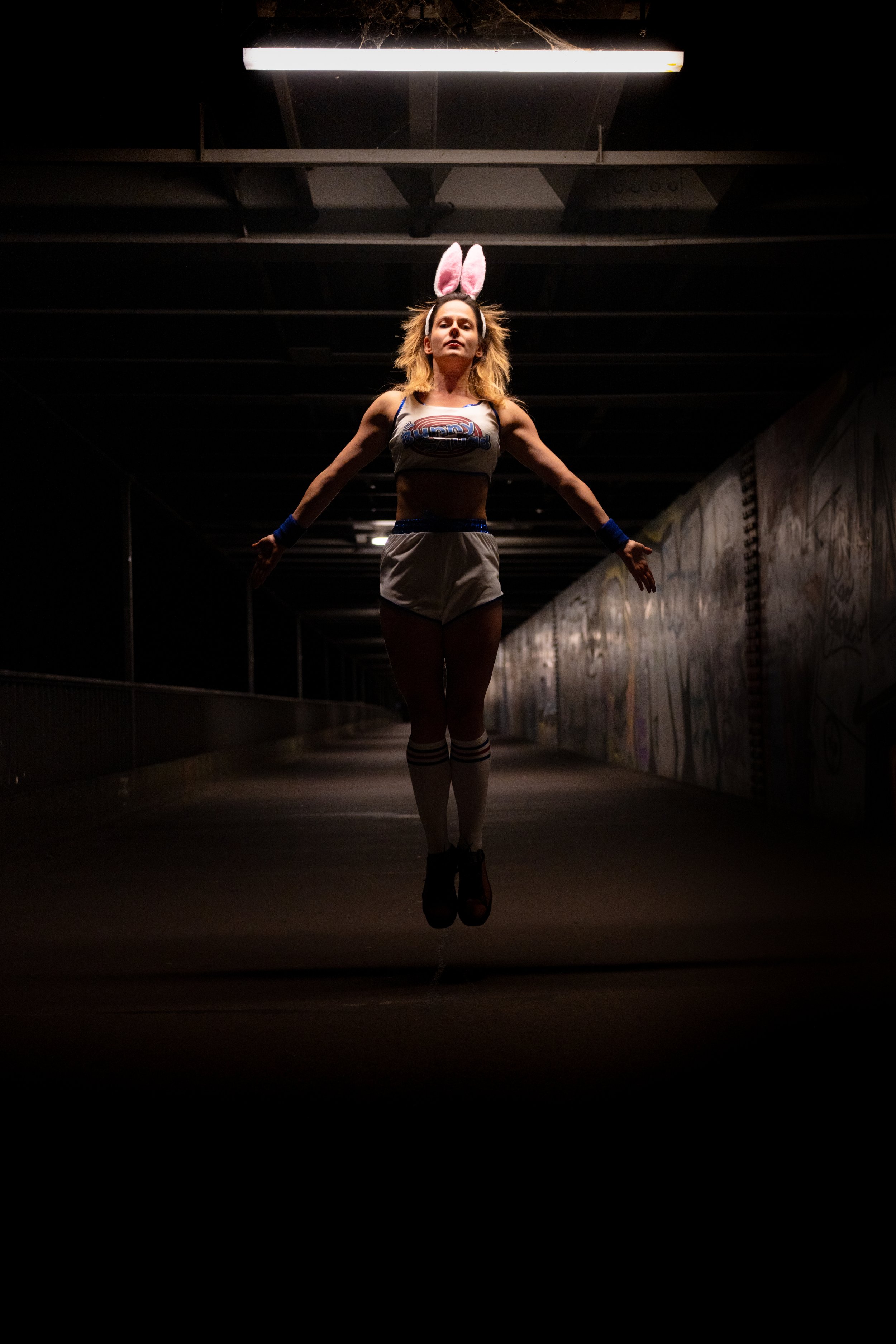 By late evening we moved to a nearby underpass. Out came the bunny outfit. Curious cyclists rolled by as she leaped and posed under the fluorescent lights.